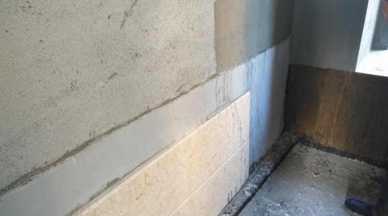 铲除原防水层,对现有立墙上翻600mm的范围、地面砂浆层和防水层进行打磨处理,直至露出结构面,对打磨过的基面有缺陷的部位采用“堵漏王”封堵,并做抹平收光处理。